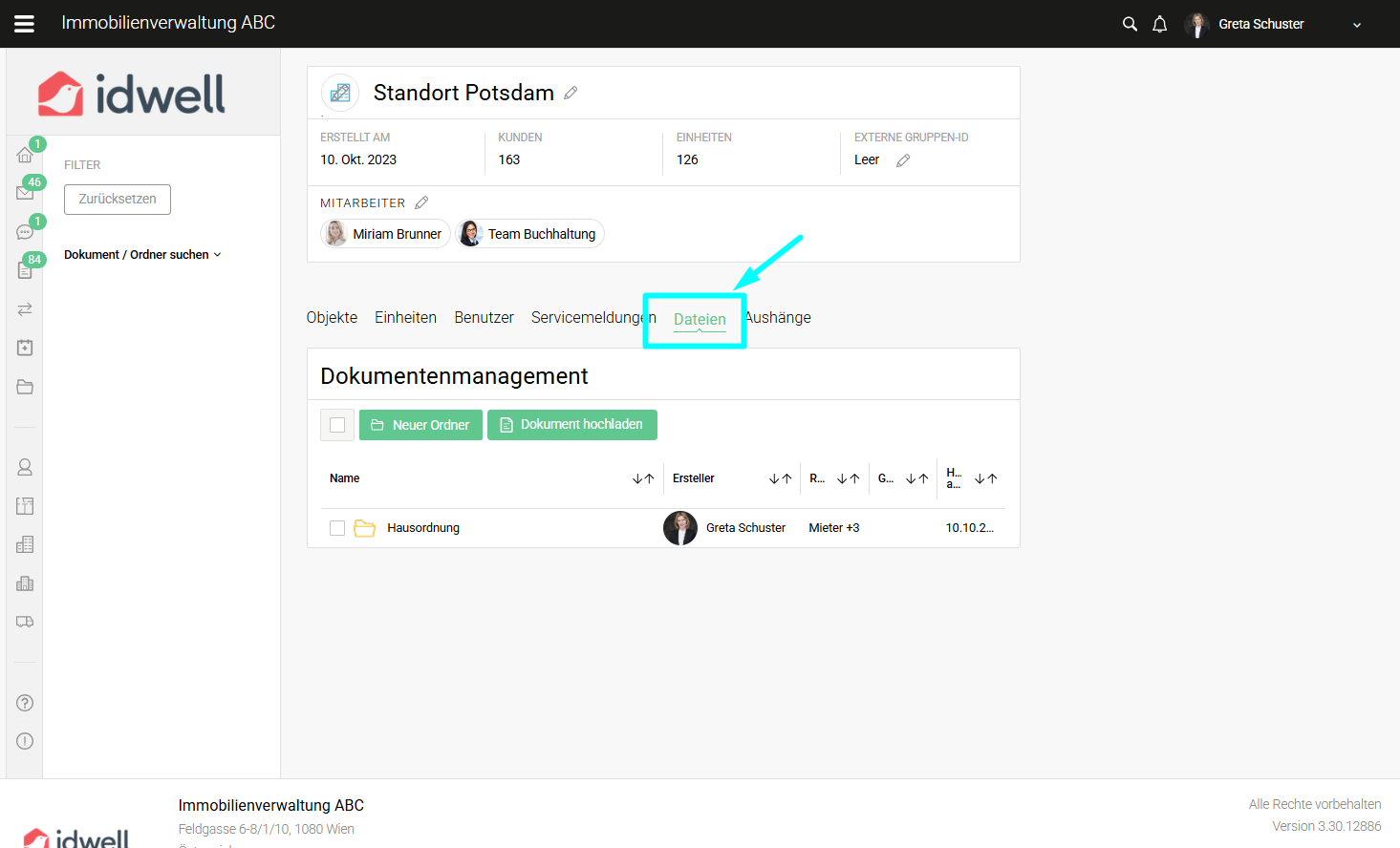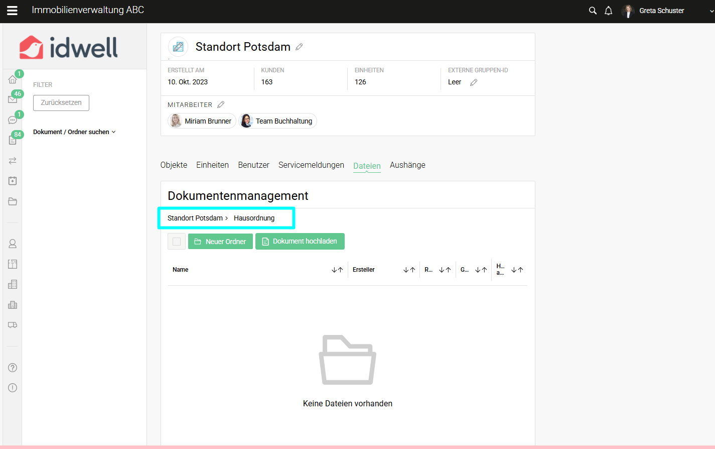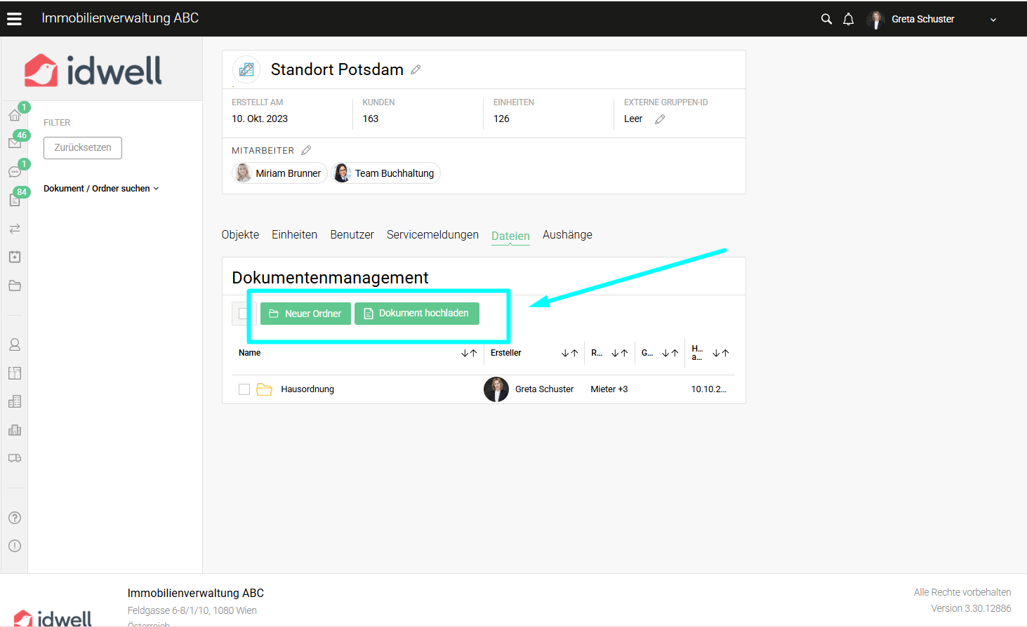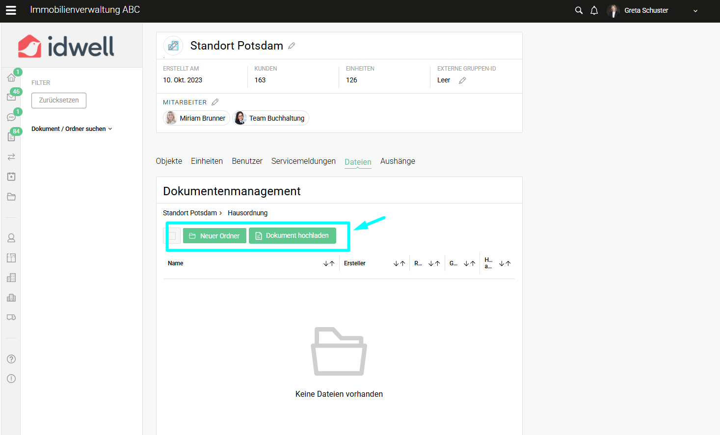 Legen Sie im Ordner wiederum eine neue Ordnerstruktur an oder laden Sie neue Dokumente hoch, indem Sie auf den Button “Neuer Ordner” oder “Dokument hochladen” klicken.