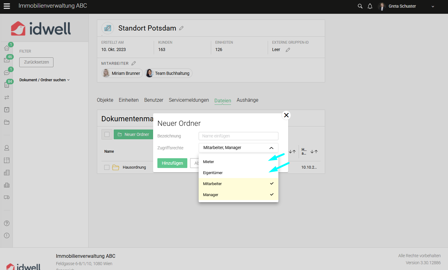Wählen Sie “Neuer Ordner” aus, so können Sie eine Bezeichnung eingeben und können entscheiden, ob Sie das Dokument nur intern hinterlegen möchten, oder ob Sie dieses Mietern und/oder Eigentümern in der Objektgruppe im Portal zur Verfügung stellen möchten.