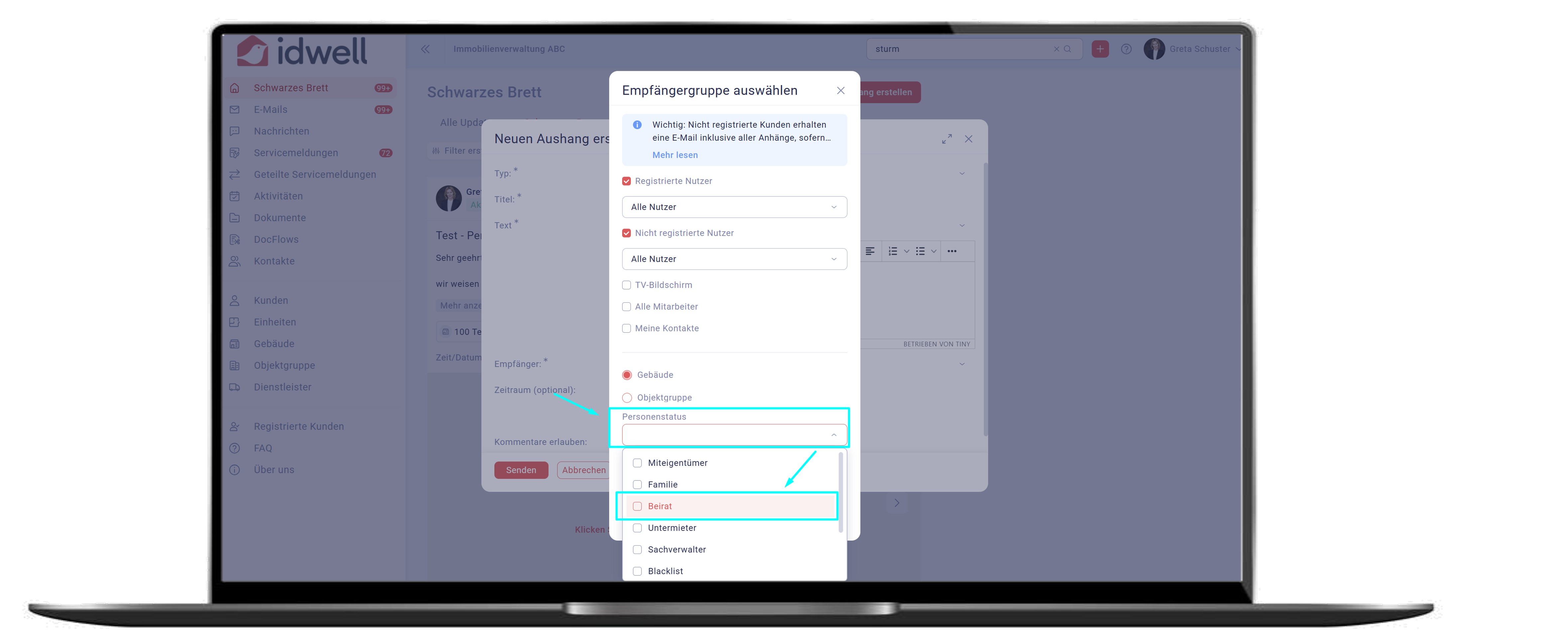 Das Schwarze Brett wurde erweitert und ermöglicht jetzt gezielte Mitteilungen an Beiräte. Informationen, Einladungen oder Protokolle können direkt an den definierten Personenkreis veröffentlicht werden. So wird die Kommunikation mit Beiräten strukturierter, transparenter und effizienter. Gleichzeitig bleiben vertrauliche Inhalte auf den dafür vorgesehenen Empfängerkreis beschränkt.