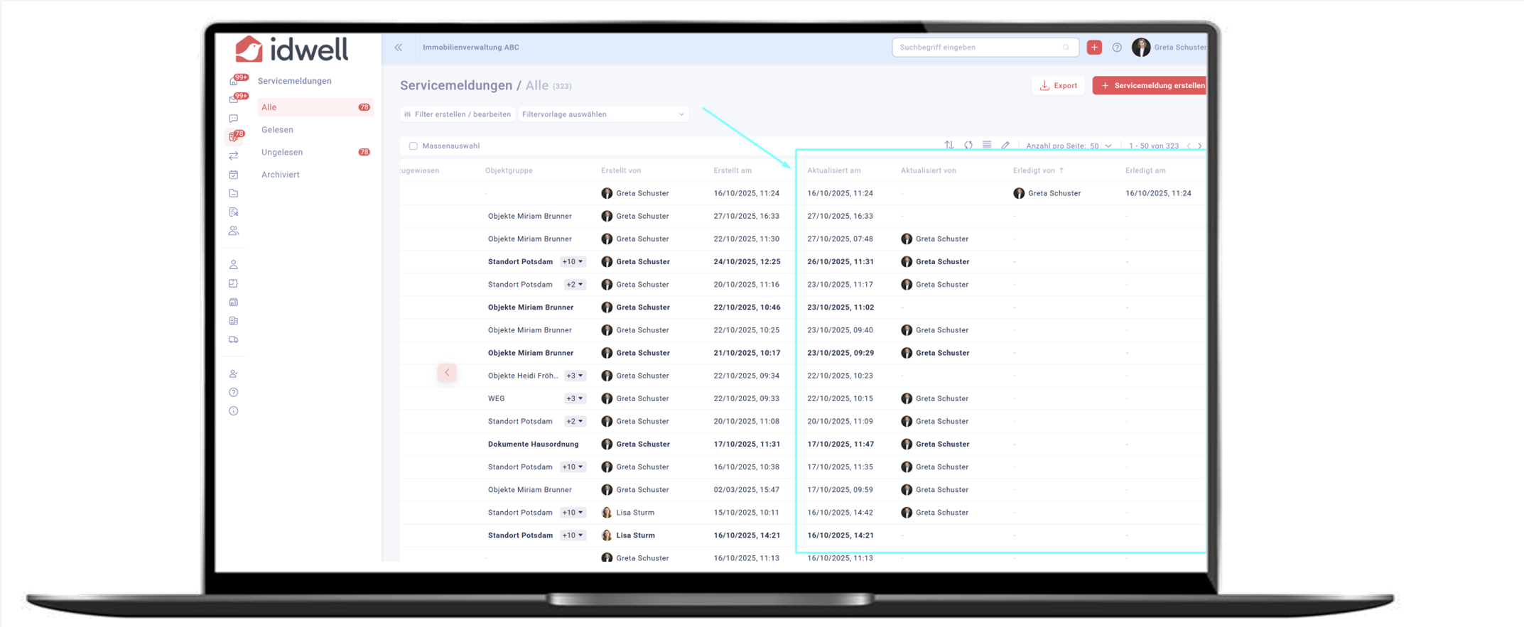 In der Servicemeldungs-Tabelle können Sie nun über separate Spalten und Filtermöglichkeiten verfolgen:
