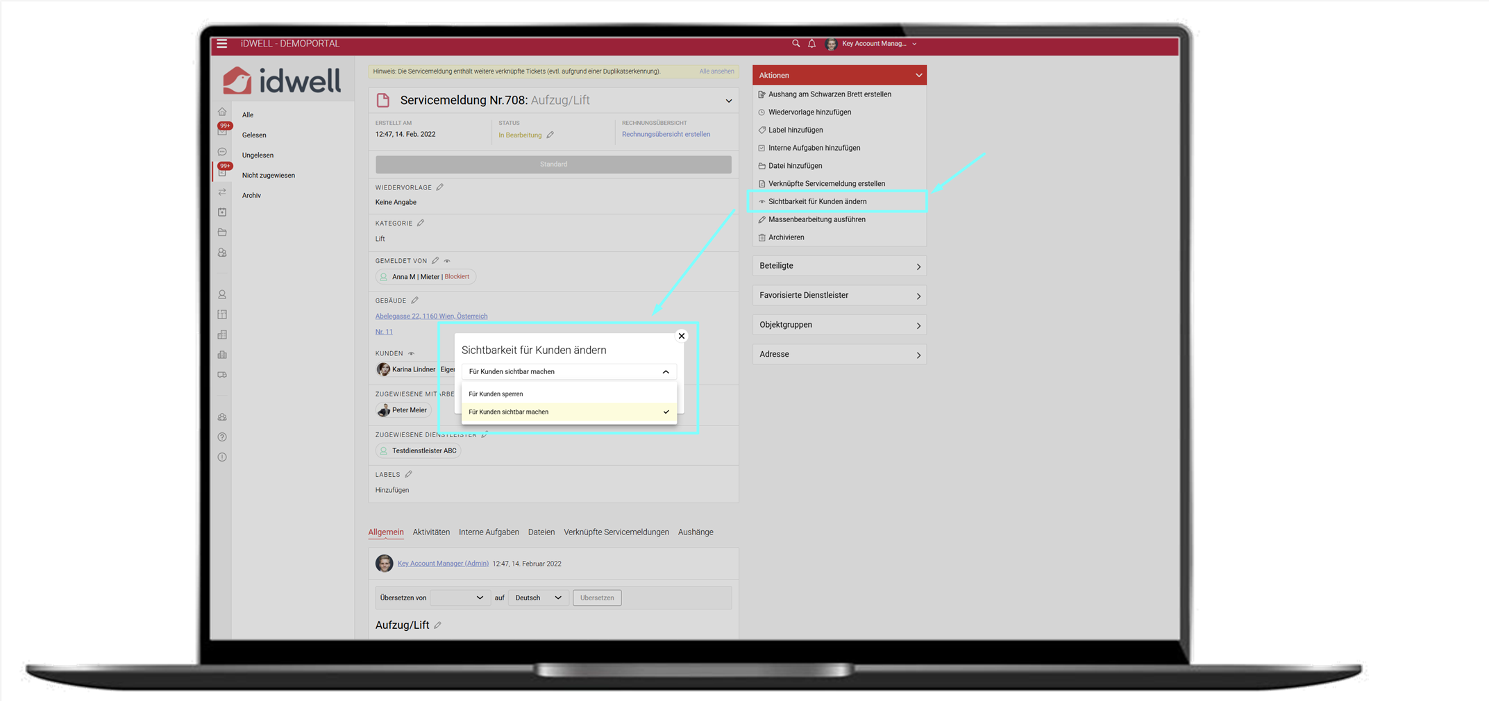 Sie können Servicemeldungen nun flexibel für Mieter oder Eigentümer sperren, auch wenn die Meldungen noch nicht archiviert worden sind. Dies ist besonders relevant für sensible Fälle wie Gerichtsprozesse, Mahnverfahren oder interne Themen, die nicht für Kunden sichtbar sein sollen.
