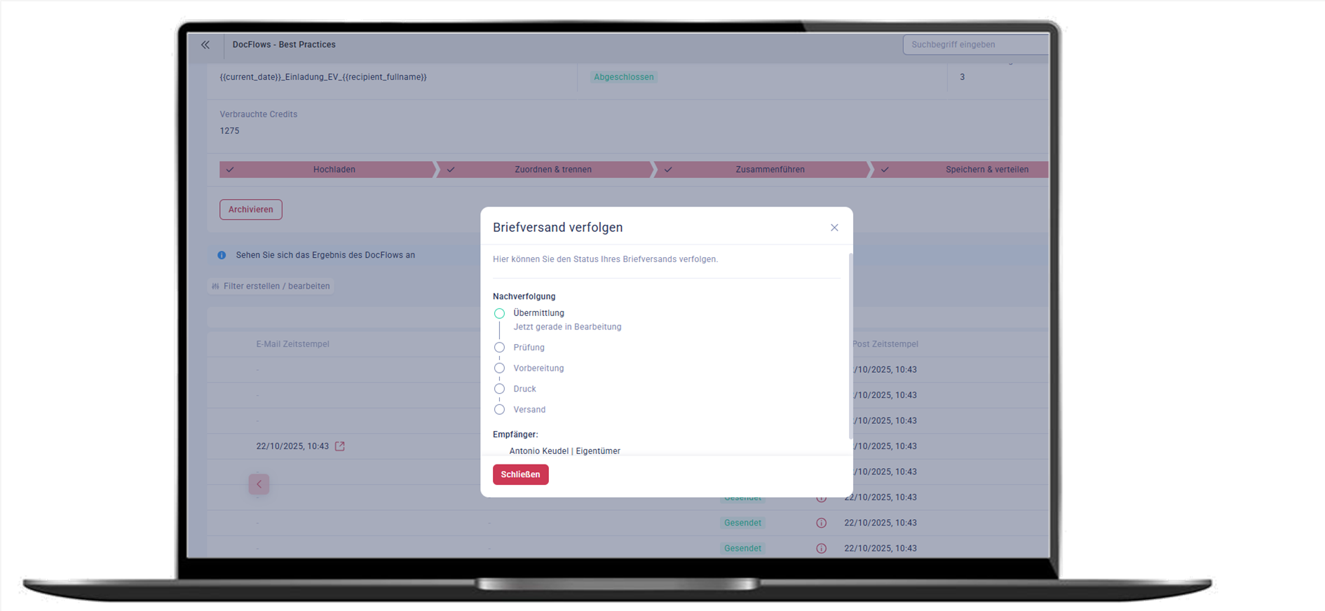 Mit der neuen Funktion können Sie den Versandstatus Ihrer Briefe direkt in den DocFlows verfolgen - vom Versand bis zur Zustellung. Volle Transparenz, kein Nachtelefonieren mehr erforderlich.