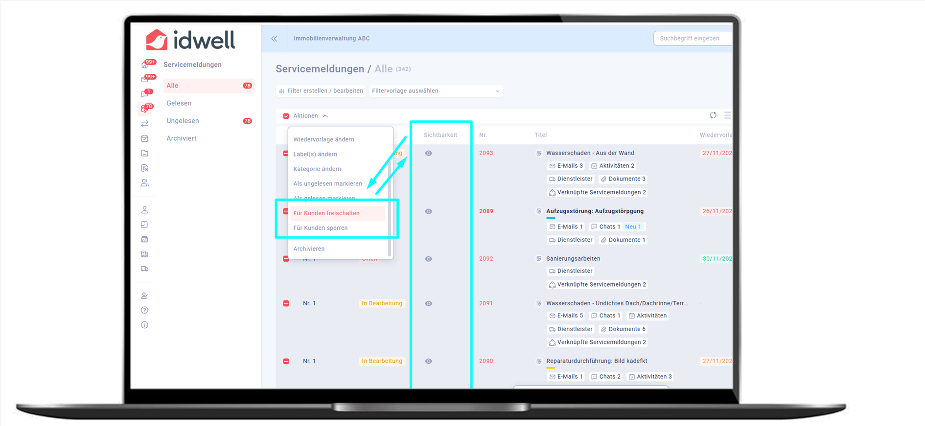 Seit dem letzten Update können aktive Servicemeldungen (= noch nicht archiviert) für Mieter/Eigentümer beliebig freigeschaltet oder gesperrt werden. Dies ist nun auch per Massenauswahl möglich bzw. haben Sie auch einen entsprechenden Filter in den Servicemeldungen, um nach gesperrten bzw. sichtbaren Servicemeldungen zu filtern. Diese sind mit Hilfe einer neuen Spalte durch ein Auge (= sichtbar) bzw. durch einen Punkt (= nicht sichtbar) gekennzeichnet.