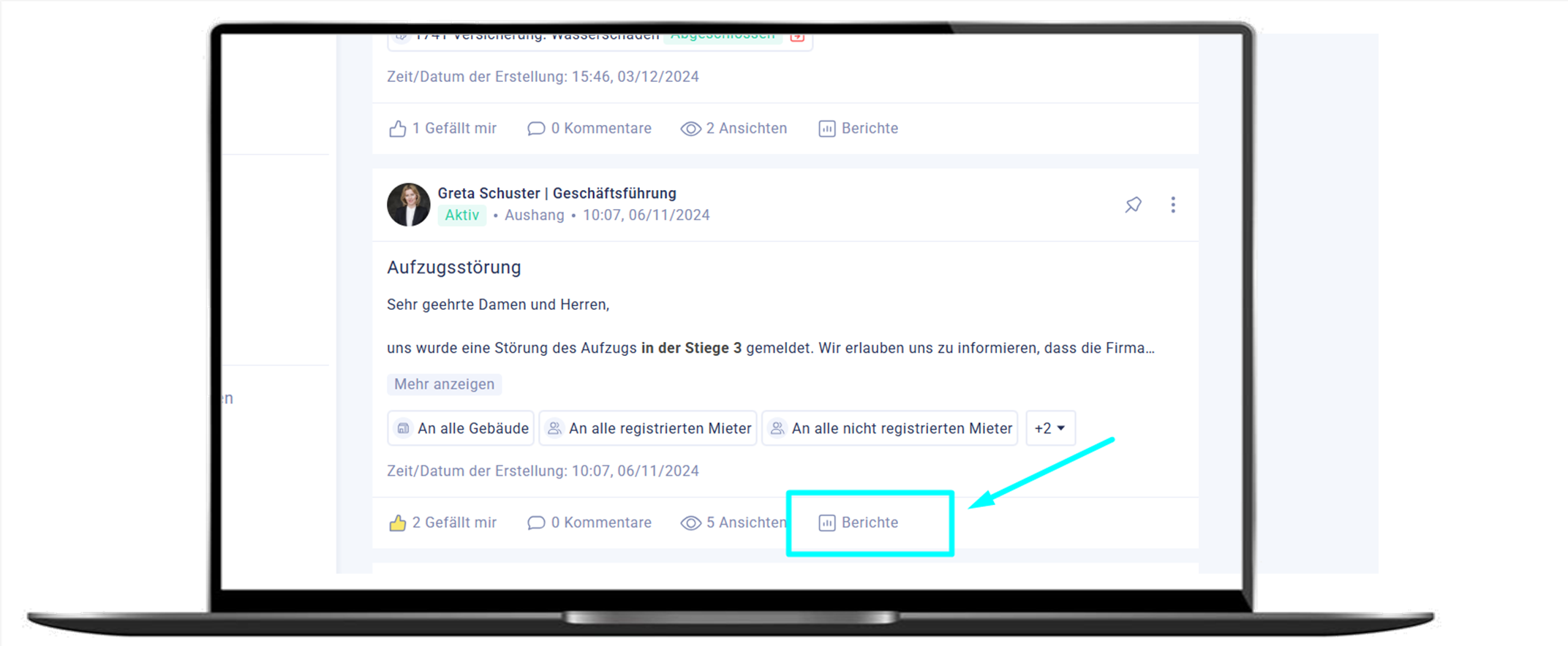 Die neue Berichtsfunktion für Ihre Aushänge zeigt Ihnen ab sofort, welcher Kunde Ihren Aushang wann mit „Gefällt mir“ markiert hat. In Kürze können Sie zusätzlich einsehen, wer den Aushang wann angesehen hat - ideal für wichtige Mitteilungen oder Informationstransparenz.