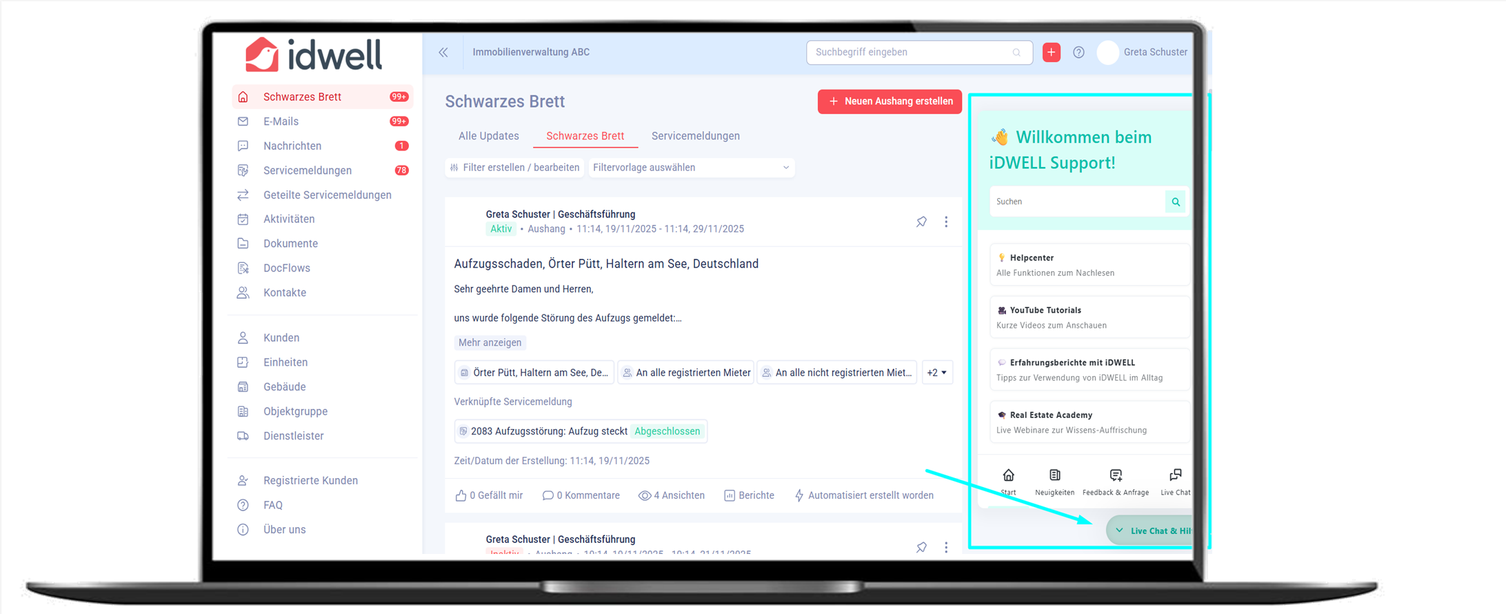 Wir verstehen, dass der neue Button für manche zunächst ungewohnt sein kann - vor allem, wenn man das Arbeiten mit der Software davor ohne den Live Chat gewohnt war. Bitte sehen Sie ihn als hilfreiche Ergänzung: Er soll Sie entlasten, Zeit sparen und Ihnen den Umgang mit iDWELL noch komfortabler machen. Damit ist es einfacher als je zuvor, sich direkt in der Software zu informieren, Unterstützung zu erhalten oder Feedback weiterzugeben.
