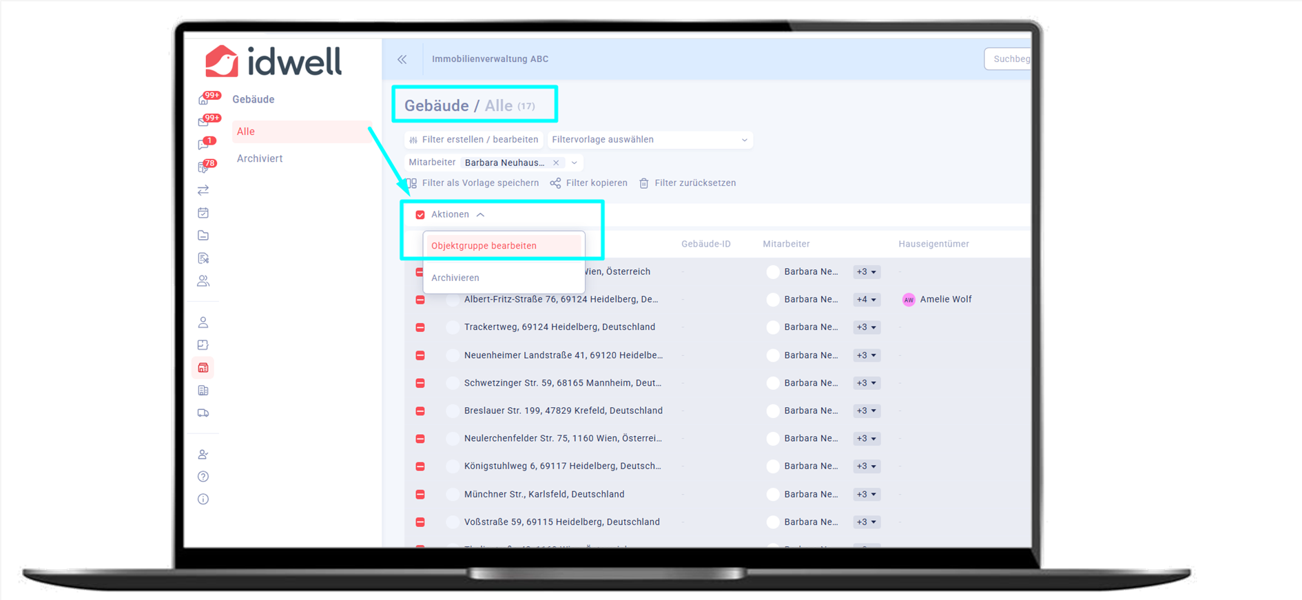 Ab sofort können Sie Gebäude über eine Massenbearbeitungsfunktion zu einer Objektgruppe hinzufügen. Dadurch können Sie mit Filtern arbeiten (zB alle Gebäude von einer Mitarbeiterin) und diese mit einem Klick einer Gebäudegruppe zuordnen. Dadurch können Sie zukünftig viel schneller Gebäude den entsprechenden Objektgruppen zuweisen.
